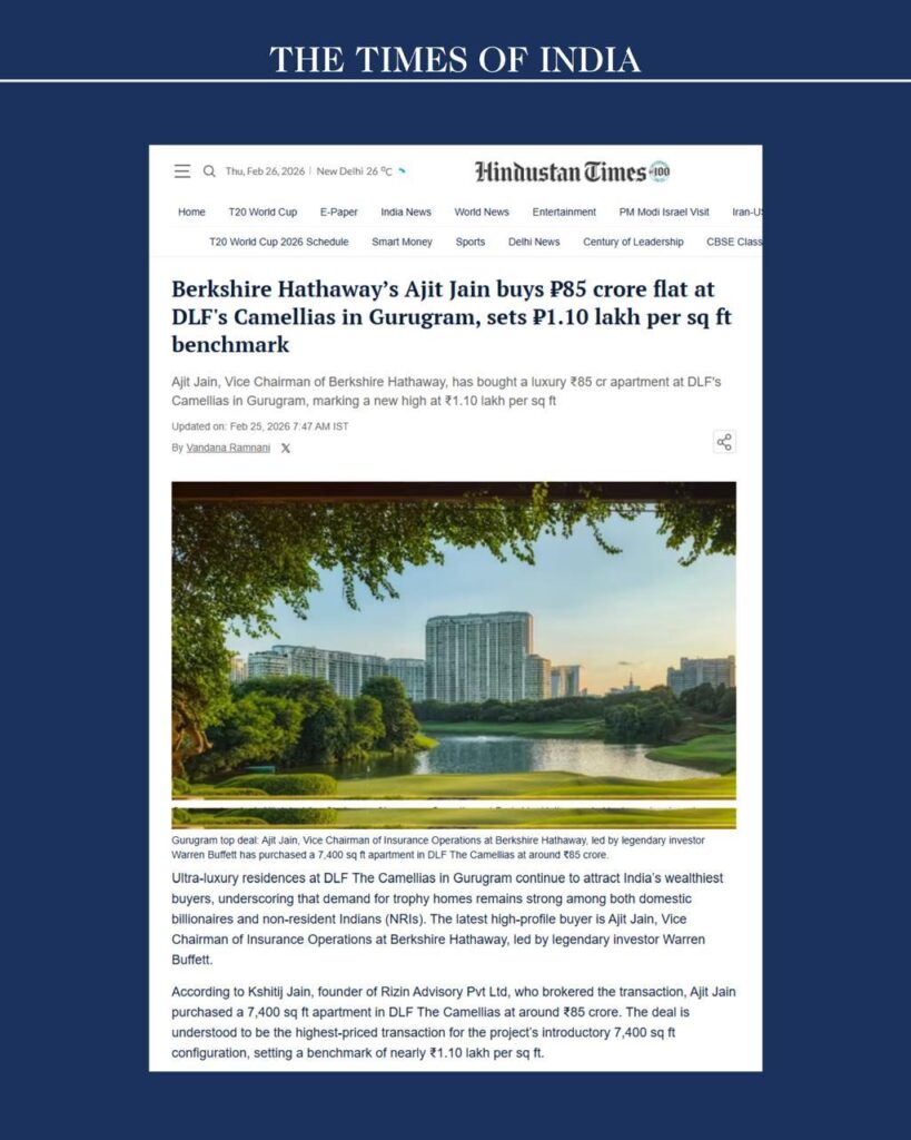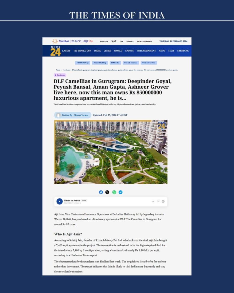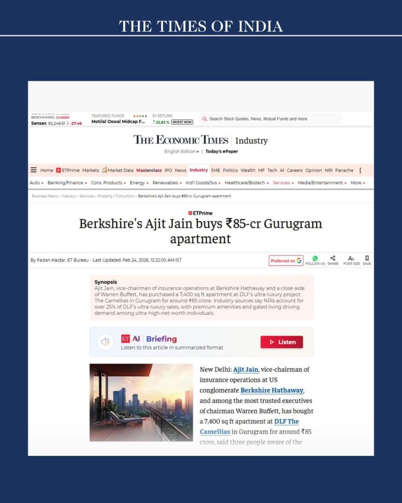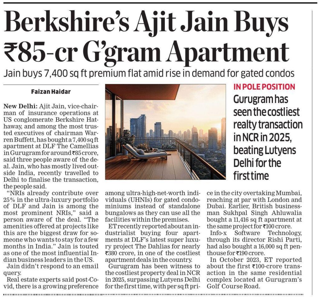 Ajit Jain, vice-chairman of insurance operations at Berkshire Hathaway and a close aide of Warren Buffett, has acquired a 7,400 sq ft apartment at DLF’s ultra-luxury project, The Camellias, for approximately ₹85 crore. The transaction adds to a growing list of marquee deals in Gurugram’s high-end housing market, which has seen record valuations in recent years.