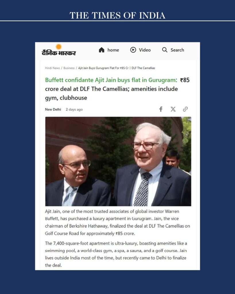 Read More :- https://www.news18.com/business/real-estate/berkshire-hathaways-ajit-jain-buys-rs-85-crore-apartment-at-dlf-camellias-in-gurugram-9925762.html